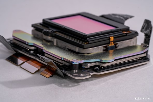 After popping the hood, so to speak, Kolari Vision immediately noticed a metal thermal frame. It’s like what’s in the a7S III, but different from what was in the a7 III and a7R IV. The Sony a1 records 4K/120p video and even 8K video, so heat dissipation needed to improve. Otherwise, the overall internal layout is familiar. The HDMI port is now connected via a folded flex cable and held in place by a bracket, whereas in prior Sony cameras, it has been soldered onto the board. That should make replacing a defective HDMI port much easier.