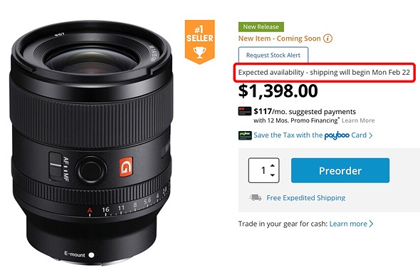| The current listing for the Sony FE 35mm F1.4 GM lens on B&H suggests units will start shipping on February 22. |