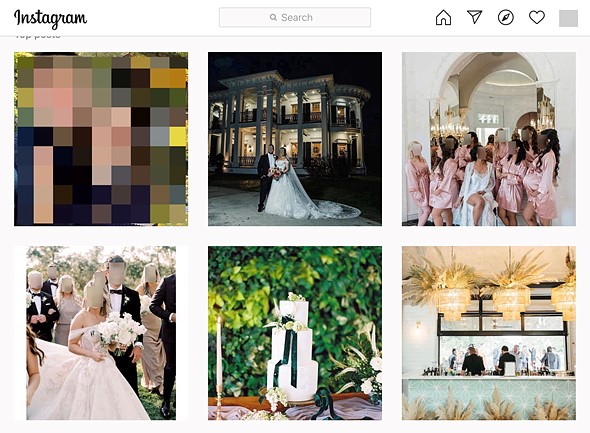 | A screenshot of a few images that show up when you search ‘#TexasWedding’ on Instagram. Faces have been blurred for privacy sake. |