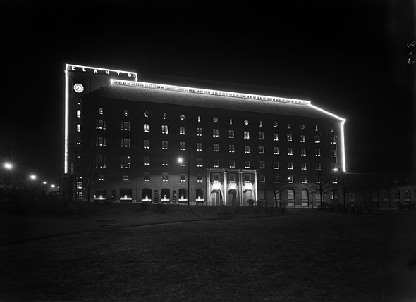 The non-translated caption that accompanies this image: ‘Elannon hallintorakennus juhlavalaistuna 25-vuotisjuhlan kunniaksi, Kaikukadun puoli.’ Used under CC BY 4.0. |