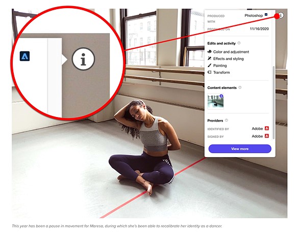 | This is what the CAI standard will look like on the ‘Verify’ page that appears when you click ‘View more’ in the ‘info’ section of the image. Click to enlarge. |