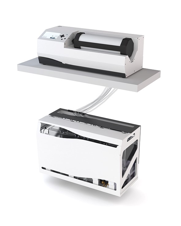 Film reels (it’s compatible with Paterson, AP and Jobo 1500 reels) are loaded onto spindles which are mounted inside a ‘semicylinder’ wherein the film is aggitated through the chemistry. Film development chemicals are delivered to the development cylinder via a set of 12 hoses (six inlet and six outlet) that run from removable two-liter and five-liter storage receptacles. The machine offers the option to salvage chemicals that can be used multiple times and dump single-use chemicals.