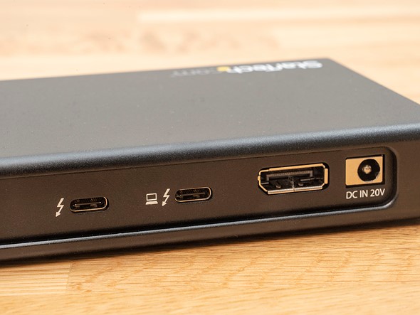 This StarTech dock has a single front-facing USB-A port running at 5Gb/s and a USB-C port running at 10Gb/s. There’s also a UHS-II SD Card slot and separate microphone and headphone sockets. At the back is where you find the upstream and downstream Thunderbolt connections as well as a Gigabit Ethernet jack, a second 5Gb/s USB-A socket, and finally a DisplayPort connector. Included in the box is a 17-inch Thunderbolt 3 cable.