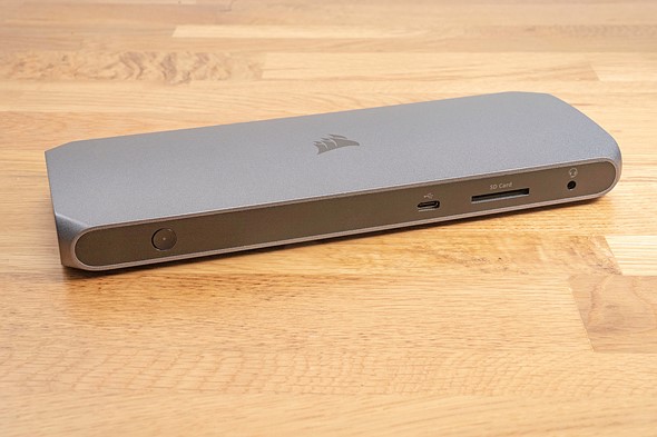 The next dock comes from one of the heavy hitters in the PC space, Corsair. There’s a certain visual appeal to this dock with its rounded edges, matt grey and black finish, and low profile design. Corsair has decided to include a power button and like the Plugable dock, you also get a longer-than-normal 25-inch Thunderbolt 3 cable.