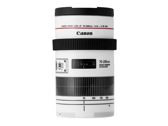 If you need something a little larger, Canon Japan has also created a tumbler modeled after its EF 70–200mm F2.8L IS III USM lens. The tumblr is constructed of plastic, features a lens cap lid and comes with a (removable) silicone grip that is textured to replicate the focus ring.