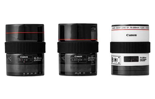 Last up is a ‘mini glass’ trio designed to look like what’s often referred to as the ‘holy trinity:’ the EF 16–35mm F2.8L III USM, EF 24–70mm F2.8L II USM and EF 70–200mm F2.8L IS III USM.
