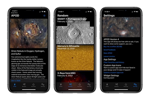 | You can pick between the APOD, a random APOD from the past or a collection of Favorite APOD images you’ve saved. |