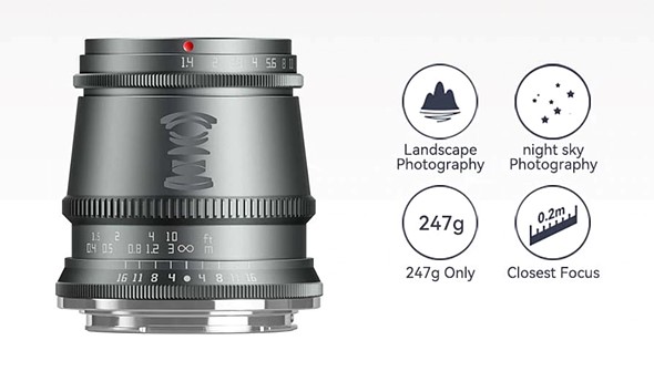 The TTArtisan 17mm F1.4 lens is constructed of nine elements in eight groups, has a minimum focusing distance of 20cm (7.9”), uses a 40.5mm front filter thread and has a 10-blade aperture diaphragm with an aperture range of F1.4 through F16.