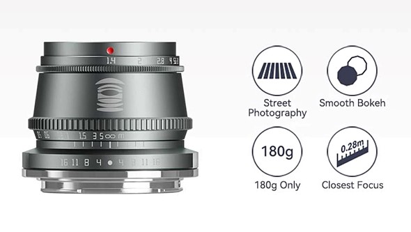 The TTArtisan 35mm F1.4 lens is constructed of seven elements in six groups, has a minimum focusing distance of 28cm (11”), uses a 39mm front filter thread and has a 10-blade aperture diaphragm with an aperture range of F1.4 through F16.