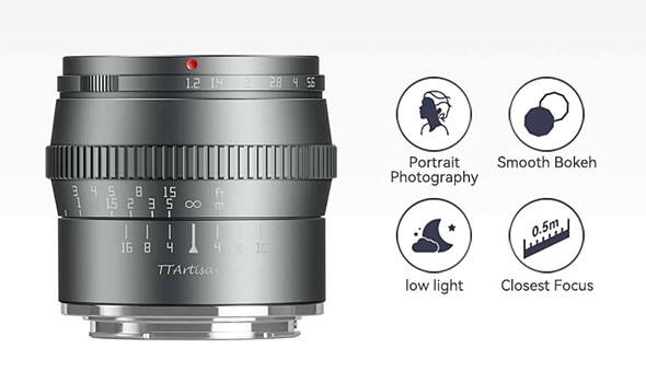 The TTArtisan 50mm F1.2 lens is constructed of seven elements in five groups, has a minimum focusing distance of 50cm (19.7”), uses a 52mm front filter thread and has a 10-blade aperture diaphragm with an aperture range of F1.2 through F16.