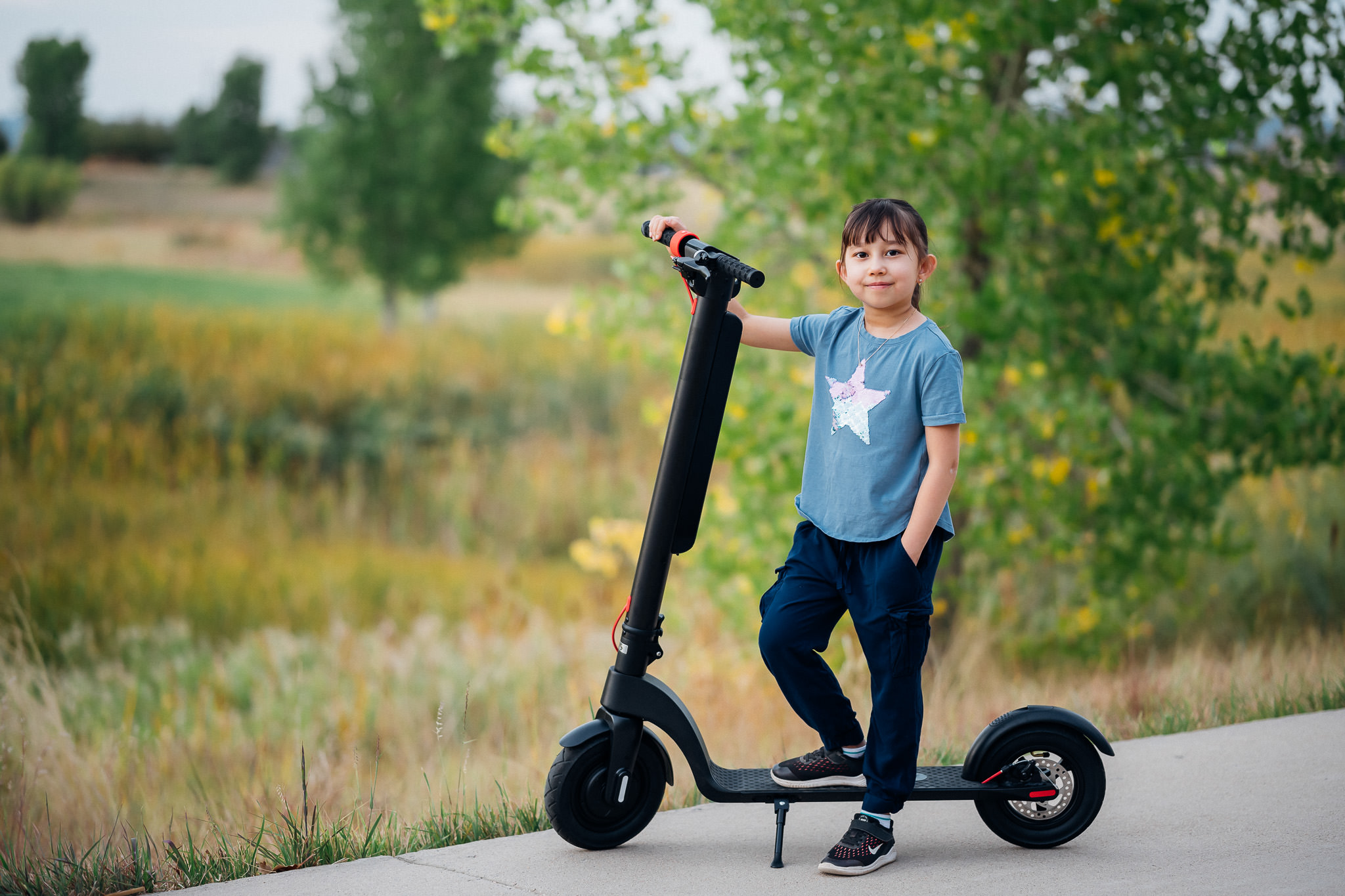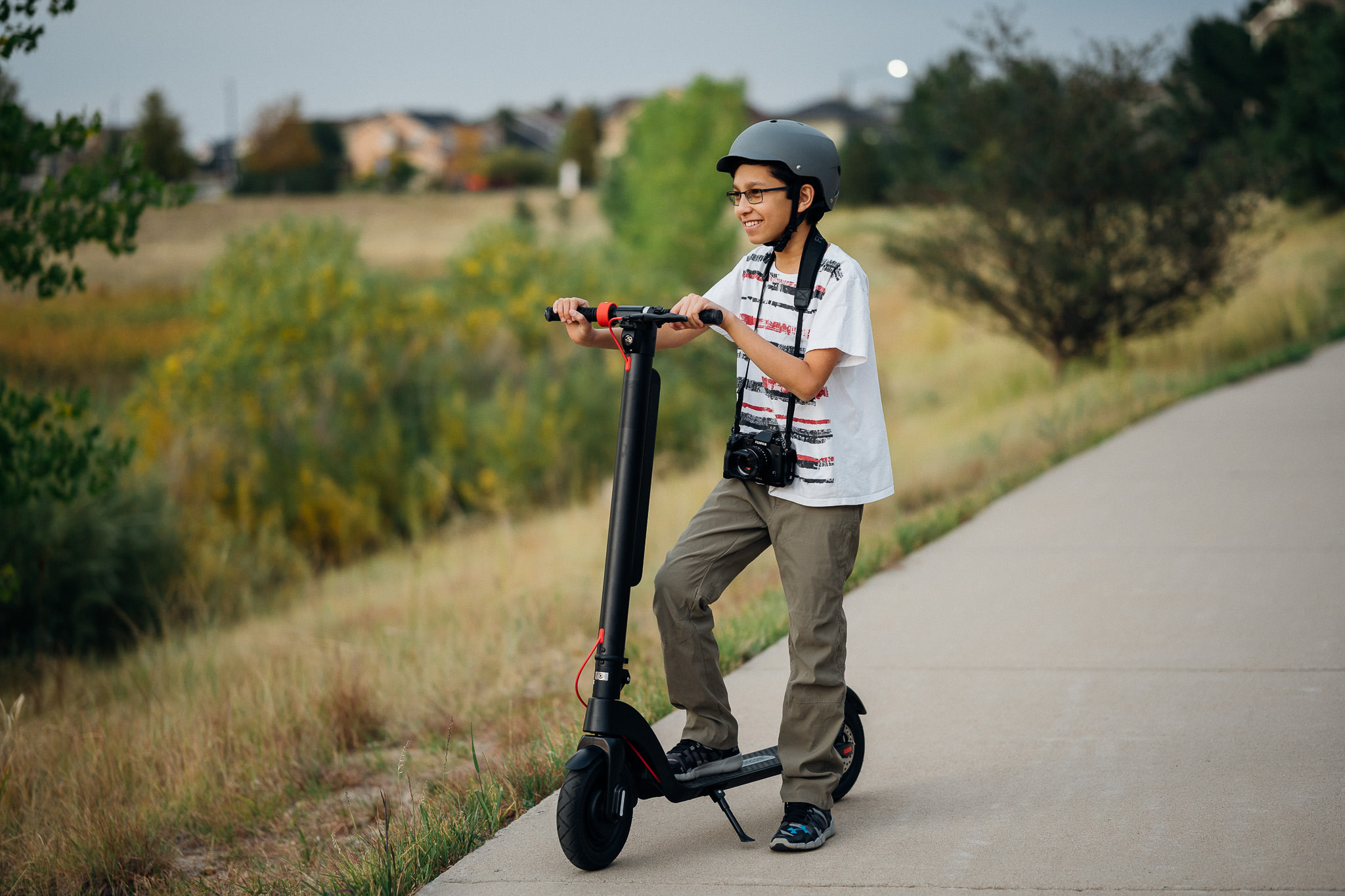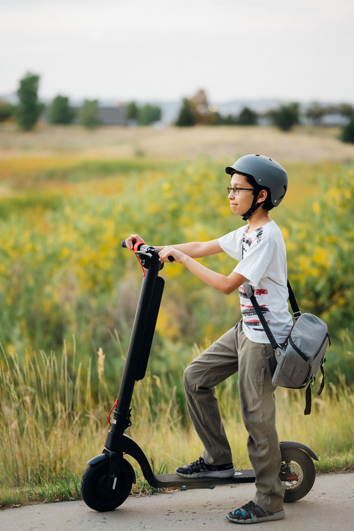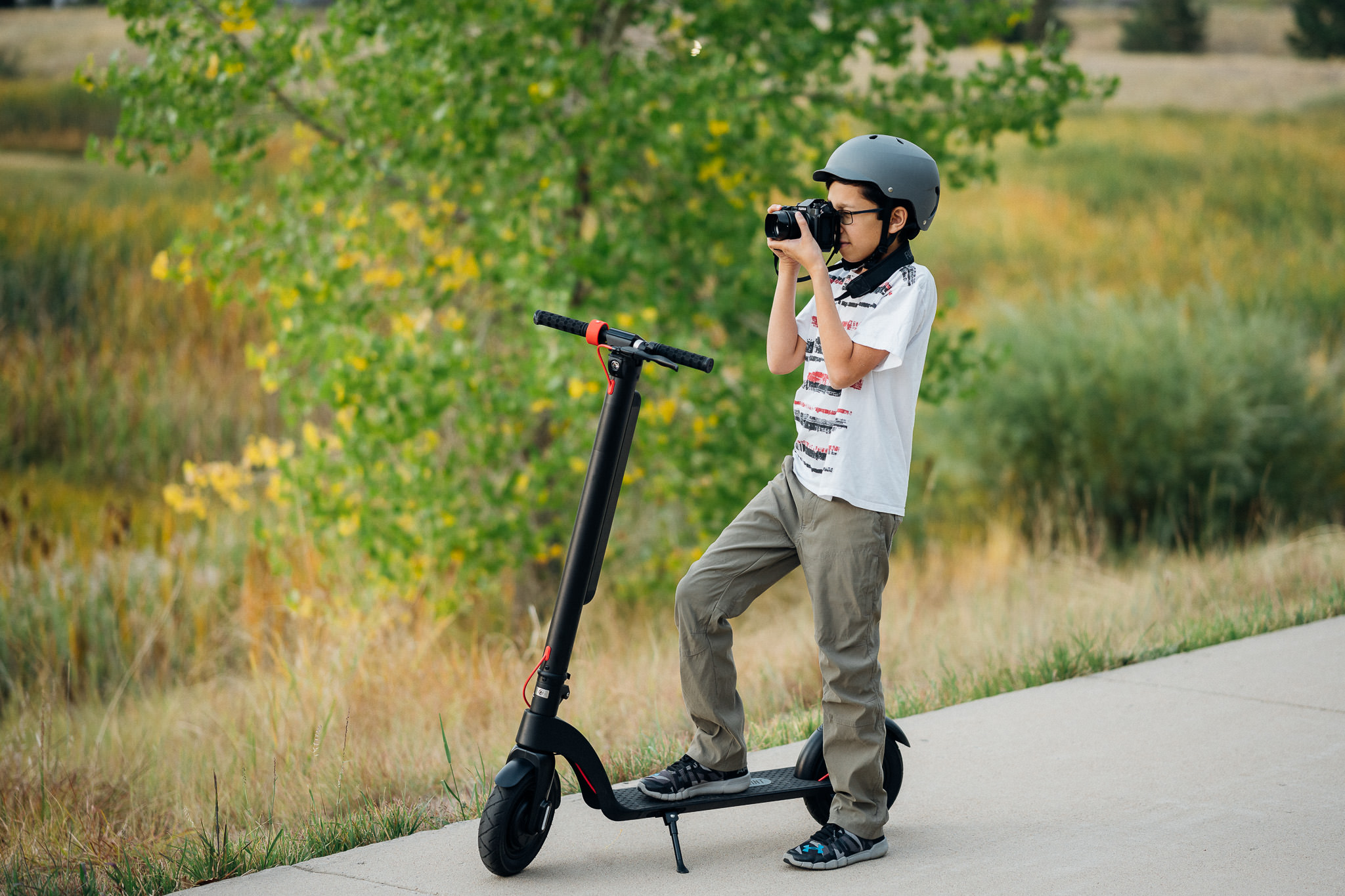 If you are planning to take pictures while riding the scooter, just stop somewhere safe, take pictures, and continue your ride. Here is my son, exploring the neighborhood on the X7 Pro with the Fuji X-H1 and XF 35mm f/1.4 R: