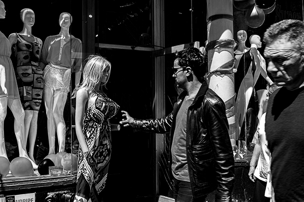 This mannequin was the perfect opportunity for a fun shot. During my NYC street photography workshop, one of my students managed to capture this shot. She found her stage, envisioned the shot, was prepared and grabbed the opportunity when the right subject entered the frame. Well done Yevette! ©Yevette Handler