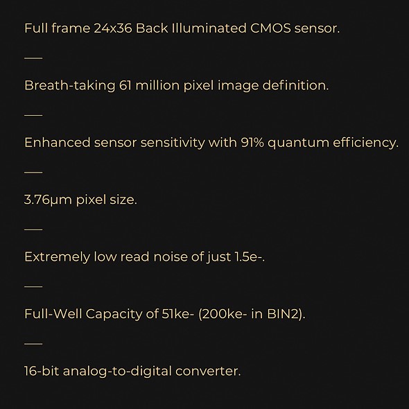 The Hyperia’s 61MP sensor is a full-frame Sony IMX455 monochromatic sensor. It’s backside-illuminated, too, which Vaonis says results in ‘91% quantum efficiency.’ Although unlikely to be needed anytime soon given the quality of the IMX455 sensor, it can be replaced within Hyperia down the road. The sensor has 3.76μm pixel size, 1.5e- read noise, 51ke- (200ke- in BIN2) full-well capacity and a 16-bit analog-to-digital converter.