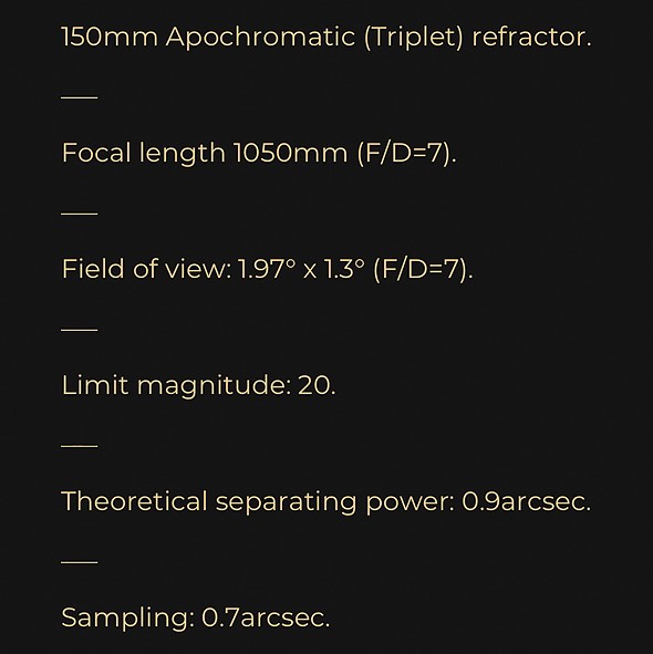 Looking closer at the Hyperia’s optics, it uses a 150mm apochromatic (triplet) refractor optic, which has a focal length of 1050mm (F/D=7). This telescope offers a 1.97° x 1.3° field of view and theoretical separating power of 0.9 arcsec.