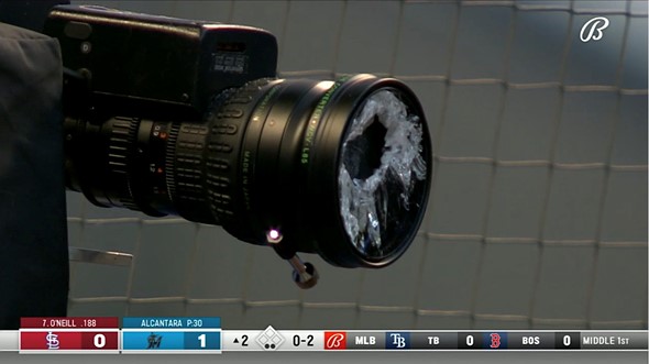 On a 0–1 pitch in the top of the second inning, Alcantara delivered a 90mph (145kph) change-up that O’Neill fouled right into a camera behind home plate. Based on the broadcast footage, it appears as though he shattered the front elements of a Fujinon WCV-L85 0.8x Wide Angle Converter lens, which was attached to the front of a Fujinon UA18x7.6BERD broadcast zoom lens. While seeing the shattered elements of the destroyed wide-angle converter is still a little heartbreaking, it’s a little easier on the heart — and wallet — considering the adapter retails for $1,799, compared to the $22,495 price tag of the lens itself.
