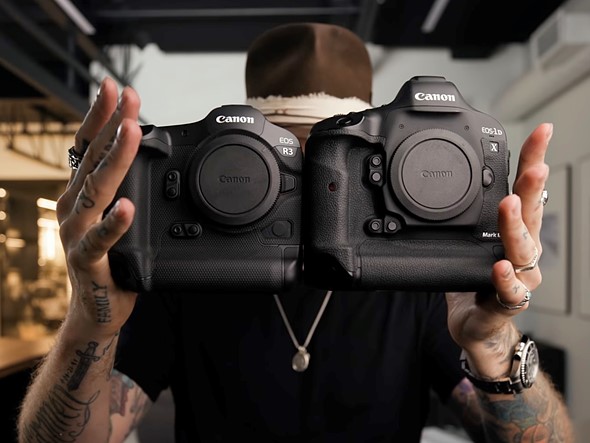 Screenshot from the video showing Peter McKinnon comparing the Canon EOS R3 (left) compared to the larger EOS 1D X Mark II (right).