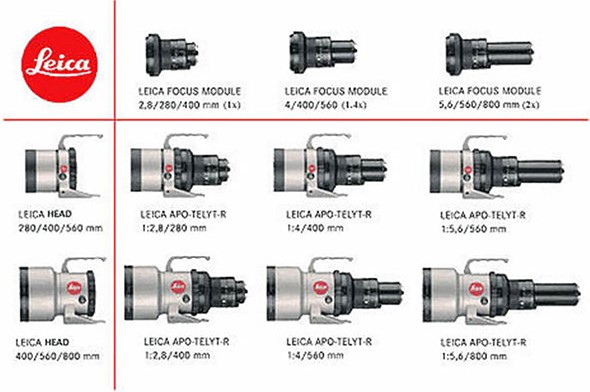 The Leica APO-Telyt-R Module System. The system includes two Leica Heads and three Leica Focus Modules, which can be combined to create six different manual focus super telephoto prime lenses. The larger head, Leica Head 400/560/800 is what’s used in the video above. This lens can be combined with the three different focus modules to build 400mm F2.8, 560mm F4 and 800mm F5.6 lenses. (Apologies for the low-quality of this image, I have tried to make it legible enough).