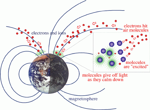 Auroras can appear as different colors, depending upon which gas electrons are interacting with and at what intensity. Excited oxygen is responsible for the familiar yellow-green aurora display, although it can also produce a red light. Nitrogen gives bluer light. Ultraviolet light is also emitted, which requires special cameras to detect.