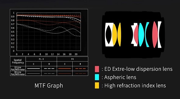 The lens is constructed of 10 elements in eight groups, including two extra-low dispersion elements, two aspherical elements and two high-refraction index elements. It uses a nine-blade aperture diaphragm, has an aperture range of F1.8 through F16 and it has a minimum focusing distance of 40cm (15.8”).