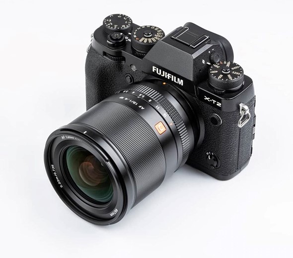 An image of the Viltrox 13mm F1.4 AF lens attached to a Fujifilm X-T2 camera system. |