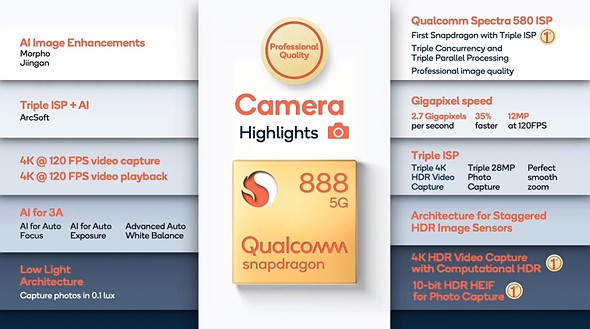 An overview of the imaging capabilities of Qualcomm’s 888 5G chipset. The 888+ 5G is nearly identical as the base 888 5G chipset, with only a few small bumps in performance. |