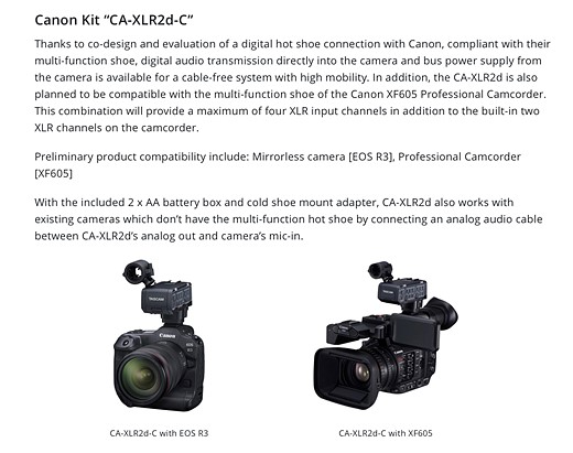 Regarding the Canon model in particular, Tascam says the ‘CA-XLR2d-C’ XLR adapter will be able to directly transmit audio and receive power from the camera via a ‘cable-free system,’ suggesting both data and power will be able to be transmitted through the hotshoe. Tascam notes ‘preliminary product compatibility’ includes Canon’s unreleased EOS R3 and the new XF605.