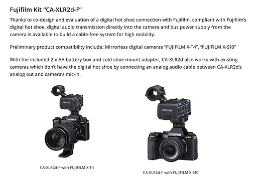 Interestingly enough, Tascam also mentions it’s developing a version of its XLR adapter for Fujifilm’s X-T4 and X-S10 mirrorless cameras that will also feature the ability to transfer audio and power through the hotshoe. This is a notable detail considering we weren’t aware, until now, that these Fujifilm cameras offered digital hotshoe mounts.
