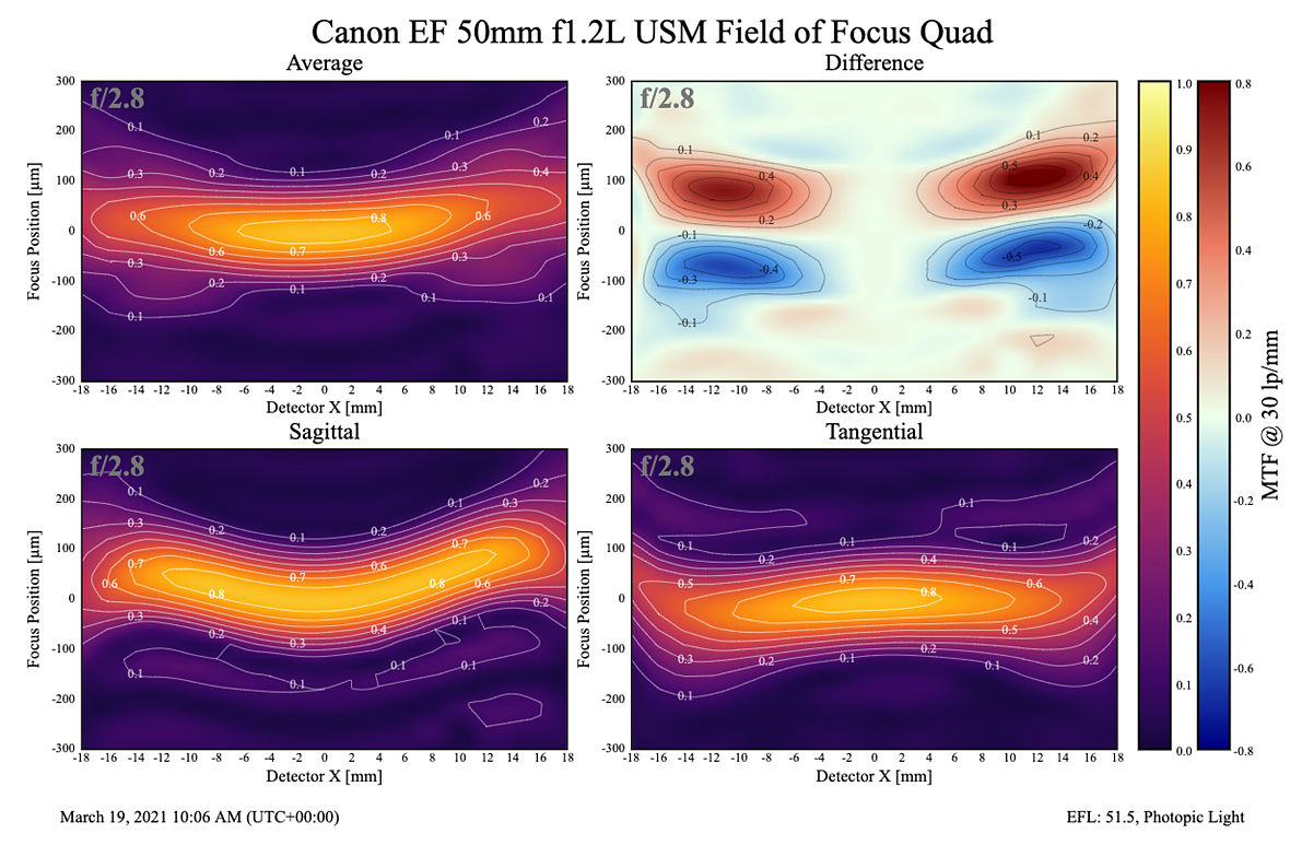 A field curvature plot shows us this isn’t a field curvature effect (although there is some field curvature). Rather, these lenses have some aberrations that aren’t really improved by stopping down all that much (3rd and 5th order astigmatism, elliptical coma, and other higher-order aberrations don’t improve much at smaller apertures).