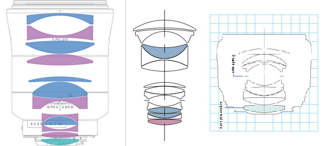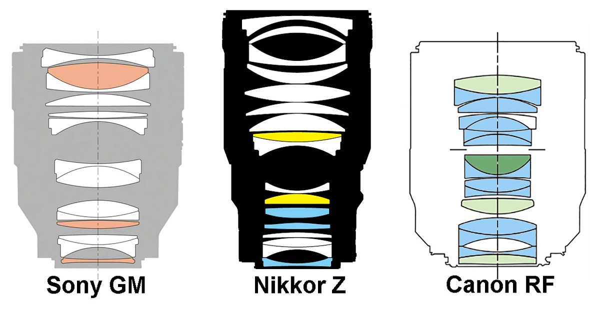 Lens diagrams of (from left): Sony FE 50mm f1.2 GM, Nikkor Z 50mm f1.2 S, and Canon RF 50mm f1.2L. (from manufacturer).