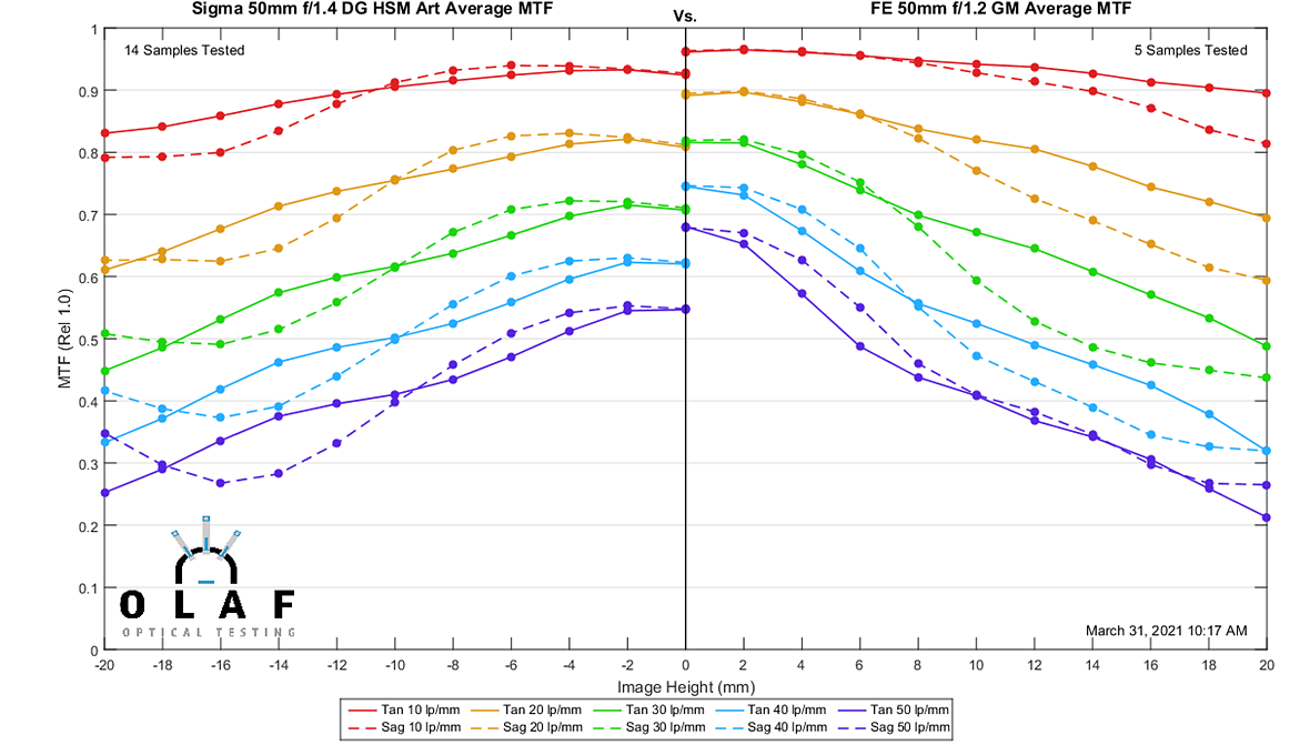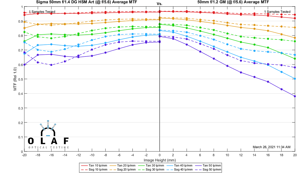 Let’s try a bit of a tougher comparison, between one of the GMs and a Sigma 50mm F1.4 Art (I flipped sides on this graph, the Sony is now on the right). There are some slight differences here, but if you’re tempted to say one is clearly better than the other, I suggest keeping quiet, because you’d be wrong. The Sigma is a tiny bit better at the edges, the Sony in the center, and the Sony has a bit less astigmatism. But the differences are very minor, to the extent that they’d be within the range of sample variation and probably not noticeable in photographs.