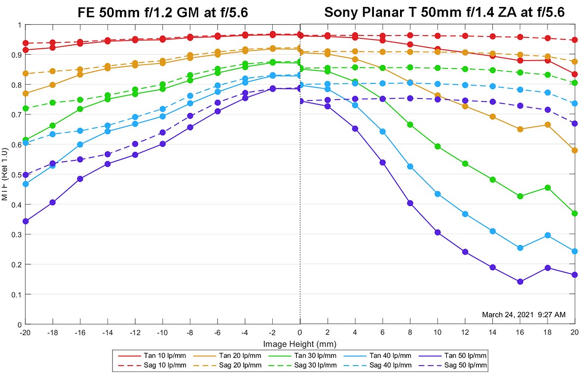 Let’s do the obvious first, and compare one copy of the F1.2 GM to one of the Sony Planar 50mm F1.4 ZA, both at F5.6. The ZA is not an awesome lens, but a lot of FE shooters have used it. Stopped down, the MTF diagram below shows its bad astigmatism. I had expected the GM to be better than this, and it is.