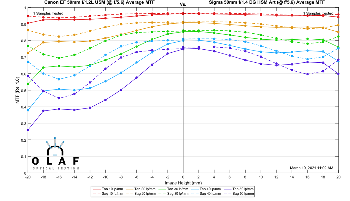 MTF of a Canon 50mm EF 50mm F1.2L lens (left) and a Sigma 50mm F1.4 Art (right).
