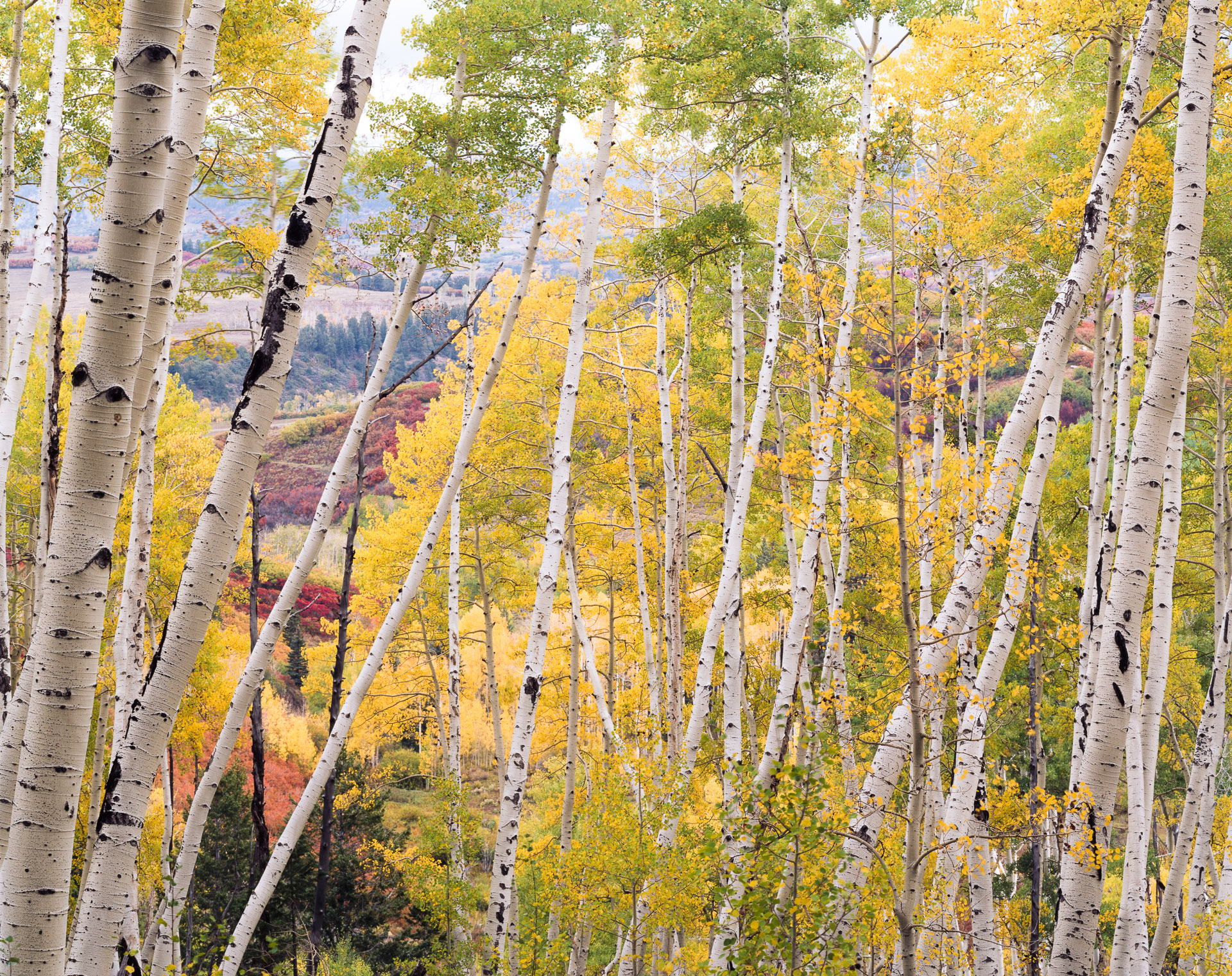 On the other hand, with my large format camera, I just point straight at the trees and use rise instead. The trees don’t go askew, and the photos look more natural to me.