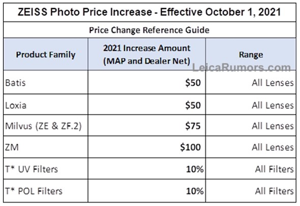 According to a graphic, embedded below and shared by Leica Rumors, lenses in the Batis and Loxia lines will increase by $50 per unit, while the Milvus (ZE & ZF.2) and ZM lenses will increase by $75 and $100 per unit, respectively. Zeiss’ T* UIV and POL filters will increase by 10% each.
